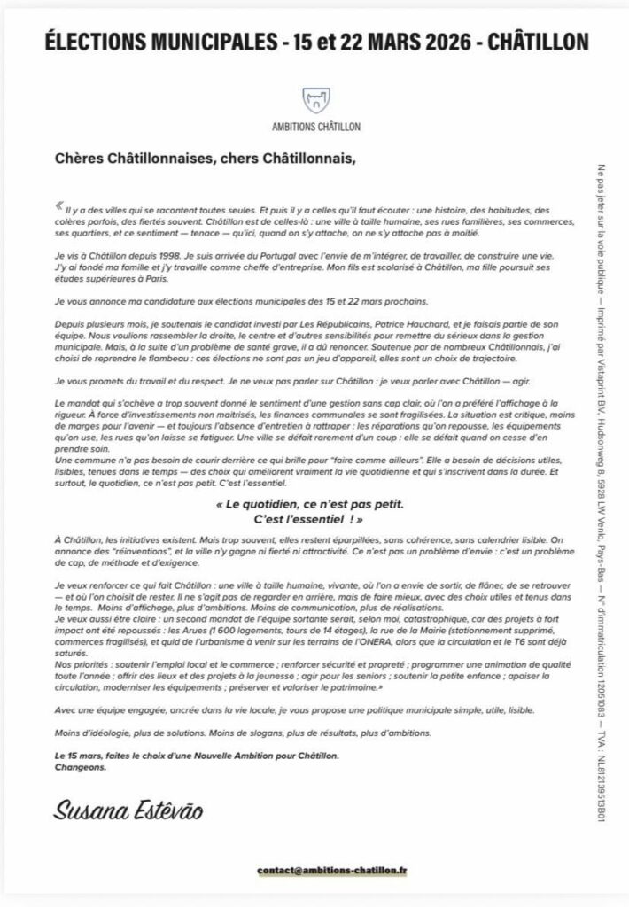 Aujourd’hui, avec sérénité et détermination, nous annonçons la candidature de Susana Estêvão aux élections municipales des 15 et 22 mars prochains.